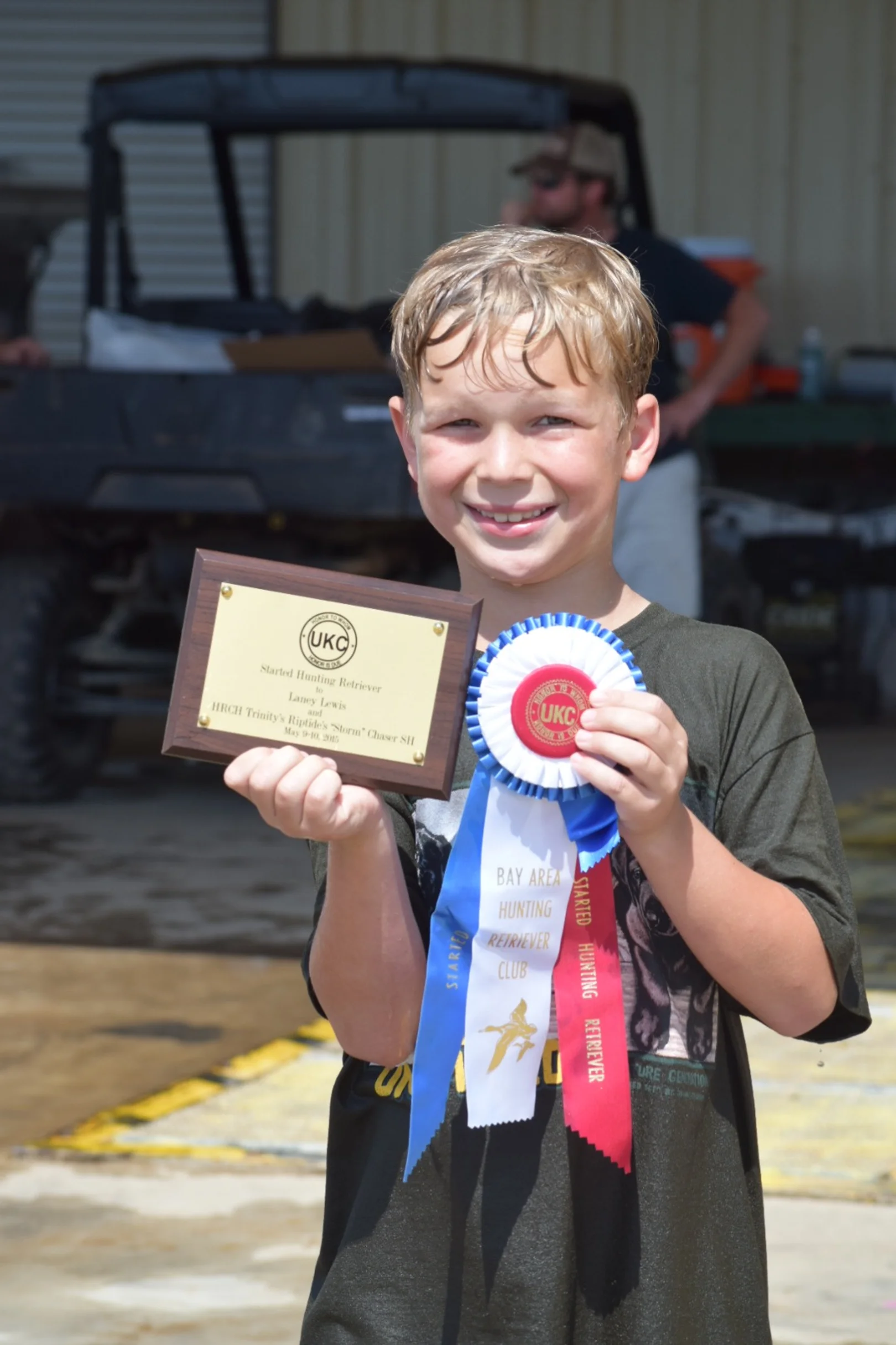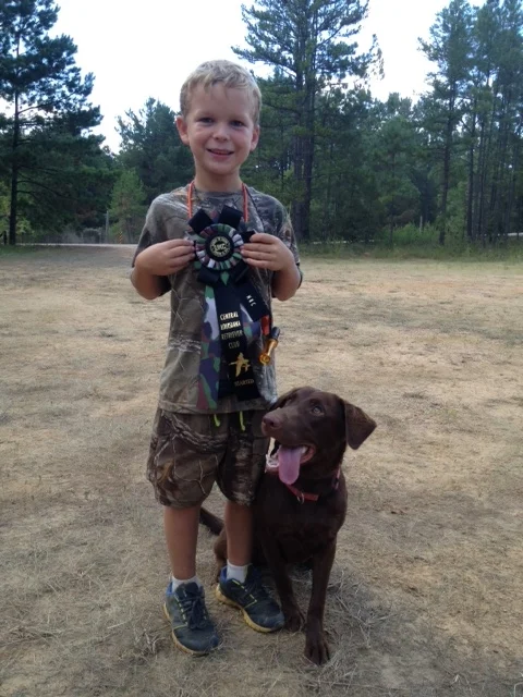 Laney (8 yrs old) handled Storm in Started, for his first time, at the North Louisiana Hunt Test in April 2015 and they passed both days!!! Way to go Laney and Storm!! They both did great! He did it all by himself!!!