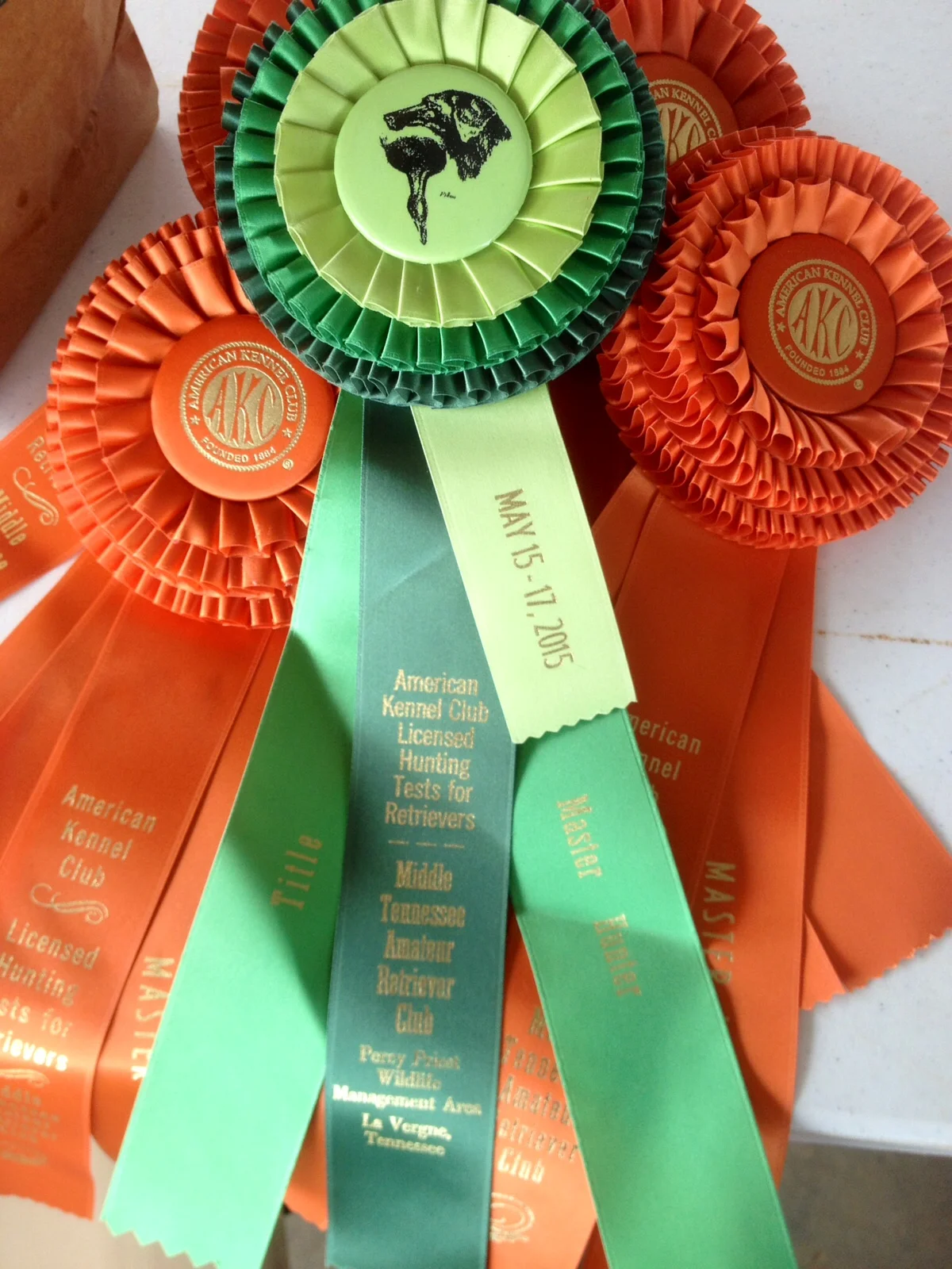 Storm with her SHR title ribbons at North Louisiana Hunt Test in Ruston, LA September 2013 at 10 months old.