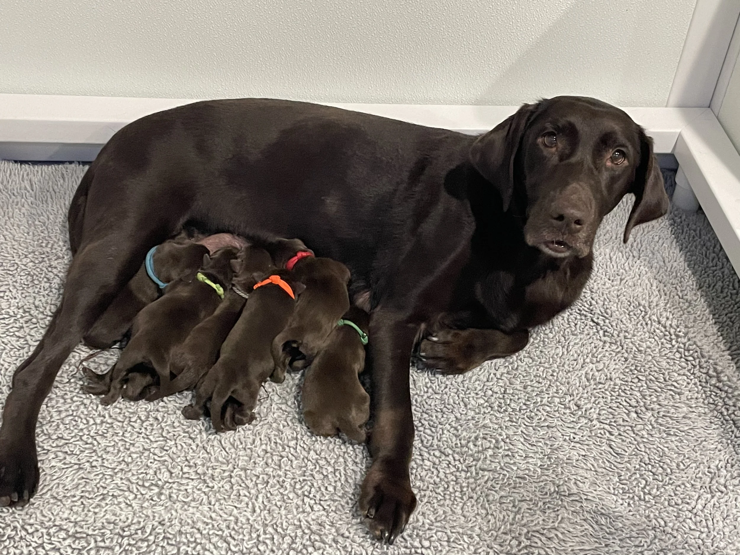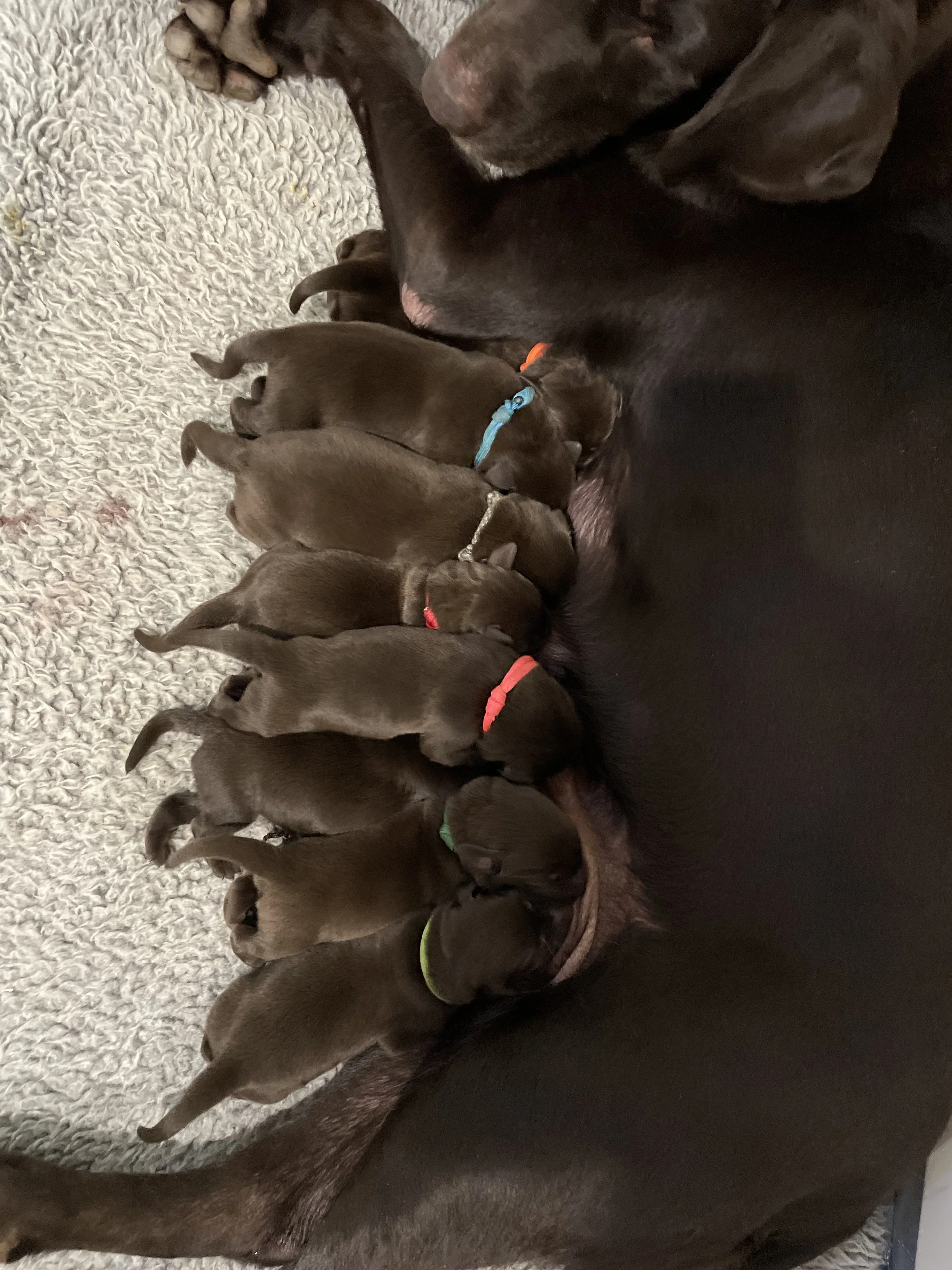 7 pups- 4 chocolate females, 1 black female and 2 black males